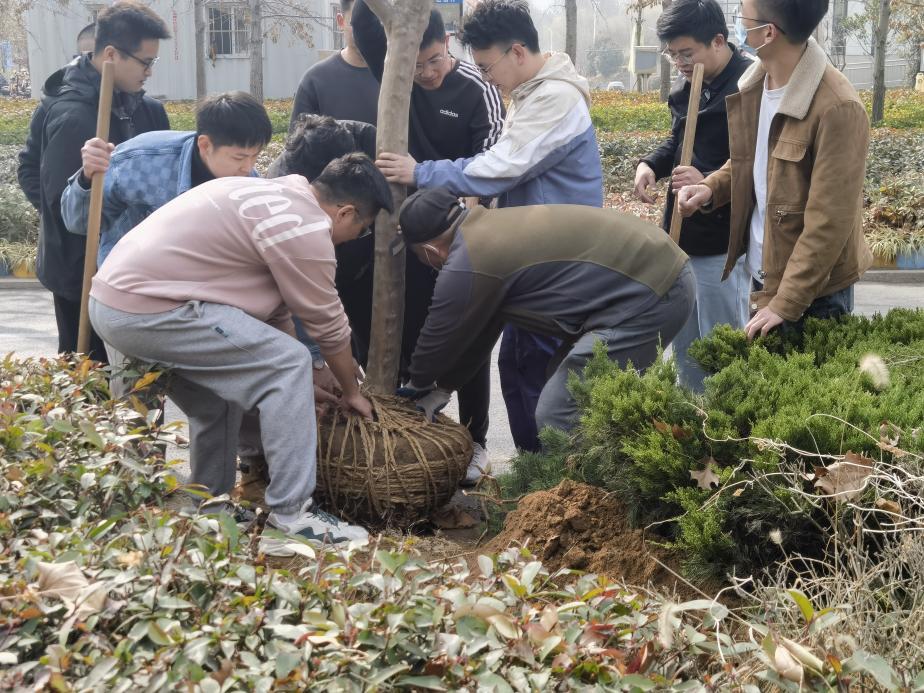 随后,在后勤处绿化科刁老师对于紫薇树生长环境要求、植树方法以及植树流程的悉心讲解下,同学们拿起铁锹倾情投入到植树活动中,几人一组相互配合,挥锹铲土、扶苗培土、围堰浇水,顺利种下饱含感恩之情的紫薇树。温暖春风里,新栽植的小树在道路上笔直挺立,萌发出盎然生机,大家以最诚的心表达自己最真的情。活动最后,学院领导以及班级全体成员在横幅上签下自己的名字,并与紫薇树合影留念。