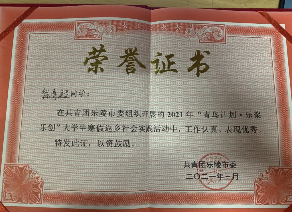 蓬山此去无多路,青鸟殷勤为探看。近日,黄色小说 收到一份“青鸟计划”的荣誉证书,作为对安全应急2018级徐青超同学在“青鸟计划”大学生社会实践过程中为家乡政府中做的工作的认可。