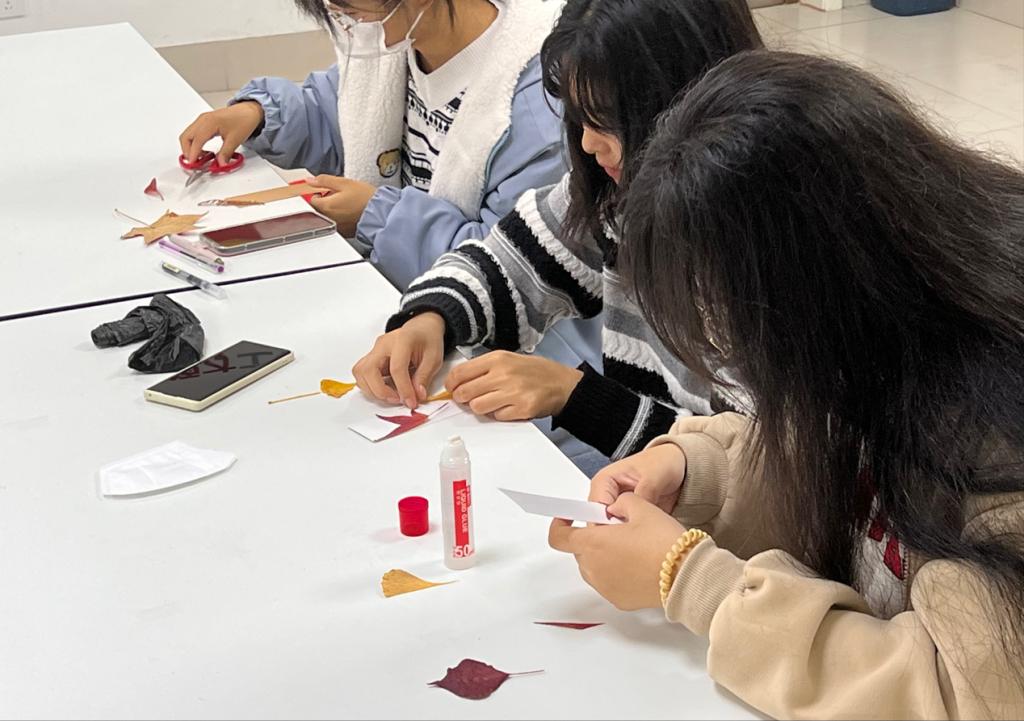 秋冬来临,枫叶、银杏、海棠……各色植物将秋冬的科大校园装点,而吹落的花枝和树叶都成为了同学们创作的原料。活动中,同学们将各种植物的落叶放置于书签、卡纸上进行搭配,并根据叶片的形状和设计的需要修剪卡纸,最后覆膜塑封、打孔、吊穗,写上自己喜爱的的诗句,创作出许愿瓶形、相框形、星星形、胶片形等形状各异的植物书签。“落霞与孤鹜齐飞,秋水共长天一色”的千古绝唱,“长风万里送秋雁,对此可以酣高楼”的高远胸襟,“停车坐爱枫林晚,霜叶红于二月花”的洒脱情怀,“树树皆秋色,山山唯落晖”的深邃意境……当秋意邂逅诗意,同学们更是发挥热爱美、发现美、创造美的能力,使用落叶、缎带等手工材料精心制作出了一张张具有特色的书签,描绘科大印象,定格科大秋冬的美好,写下了专属于安全学子的诗意浪漫。