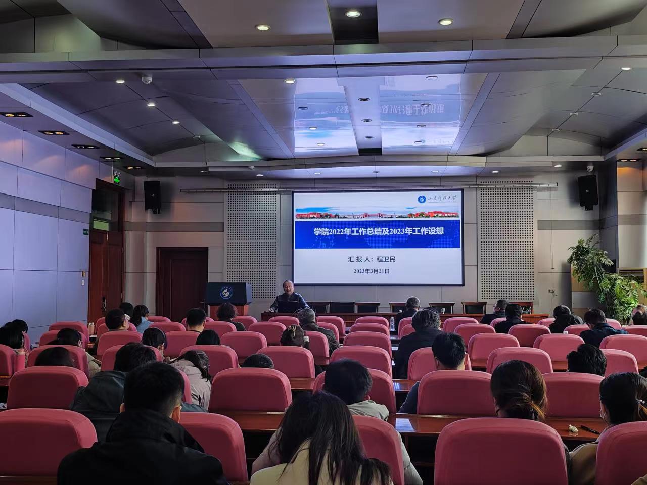 学院副院长刘音、周刚、聂文分别从教学、科研、研究生培养教育等方面回顾总结了2022年的主要工作,并就近期重点工作进行了部署安排。