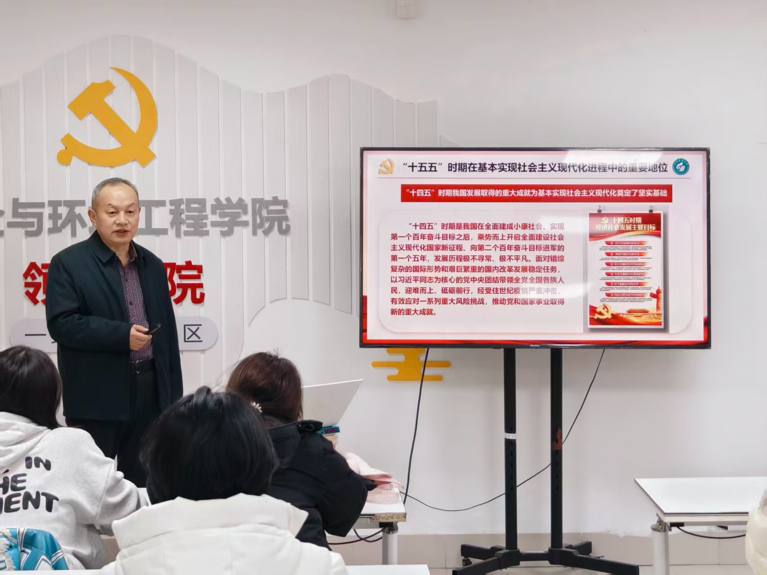 张恩生聚焦“十五五”时期生态环保领域的重点任务,结合环境工程专业特色展开系统解读。他提到,全会明确提出“美丽中国建设取得新的重大进展”的目标要求,强调要持续深入打好污染防治攻坚战,统筹水资源、水环境、水生态治理,加强土壤污染源头防控,推进固体废物资源化利用,加快发展方式绿色转型。这些部署与环境工程专业的人才培养方向高度契合,为同学们的专业学习和未来发展指明了清晰路径。他结合学校“十五五”规划编制和第四次党代会“十大工程”推进情况,强调学校正围绕教育科技人才一体化发展布局,通过建设高水平实验室、拓展校企合作平台、开展产学研协同创新等举措,为同学们搭建起成长成才的广阔舞台。