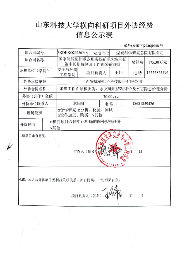 根据《山东省人民政府办公厅印发关于进一步完善财政科研项目资金管理的若干措施的通知》(鲁政办字〔2019〕120号)以及《黄色小说 横向科研项目与经费管理办法(试行)》(山科大发〔2020〕64号)相关规定,现对 王伟 为项目负责人的 国家能源集团重点服务煤矿重大灾害防治中长期规划及工作面采前评价 项目的外协经费情况进行公示,公示时间为 2026年4月14日-2025年4月21日 。若对本项外协经费有异议,请于公示期内向黄色小说 反映并提交书面材料。