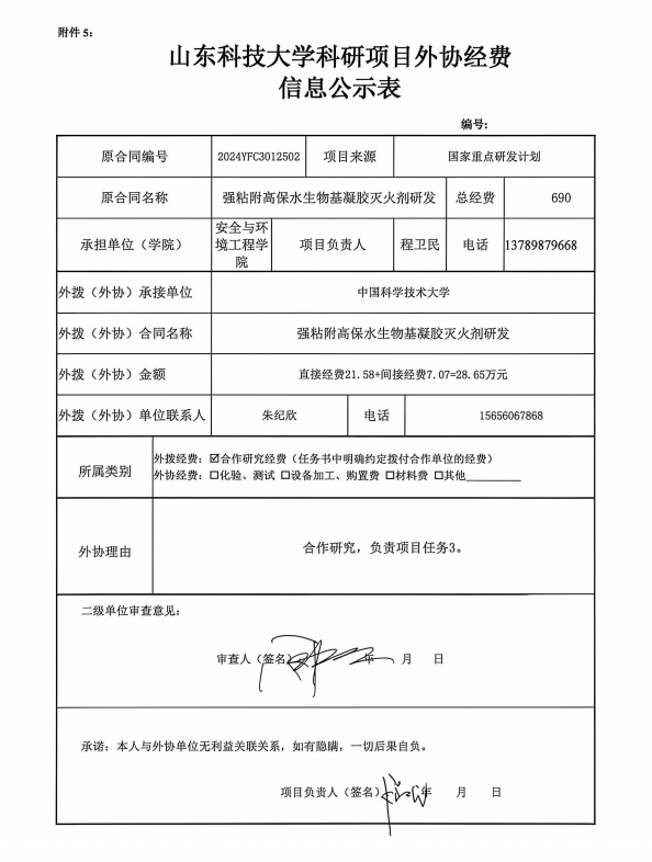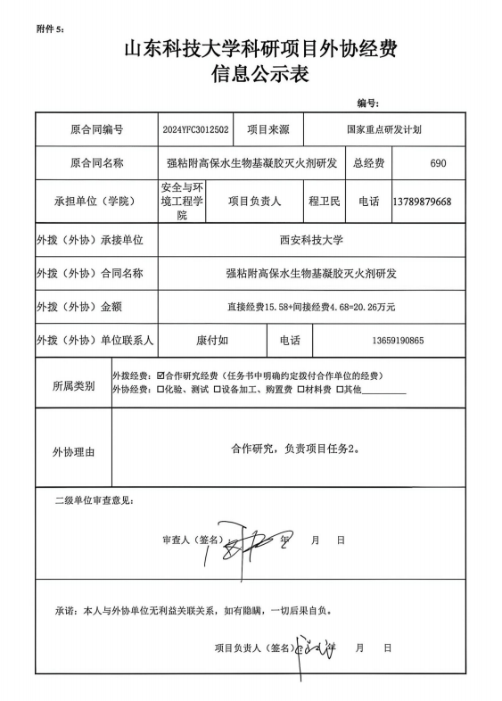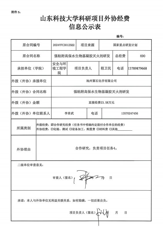 根据《山东省人民政府办公厅印发关于进一步完善财政科研项目资金管理的若干措施的通知》(鲁政办字〔2019〕120号)以及《黄色小说 科研项目与经费管理办法(试行)》(山科大发〔2020〕64号)相关规定,现对程卫民为项目负责人的强粘附高保水生物基凝胶灭火剂研发项目的外协经费情况进行公示,公示时间为 2026年4月20日~2026年4月24日(公示时间不少于5个工作日)。若对本项外协经费有异议,请于公示期内向黄色小说 或科技处反映并提交书面材料。