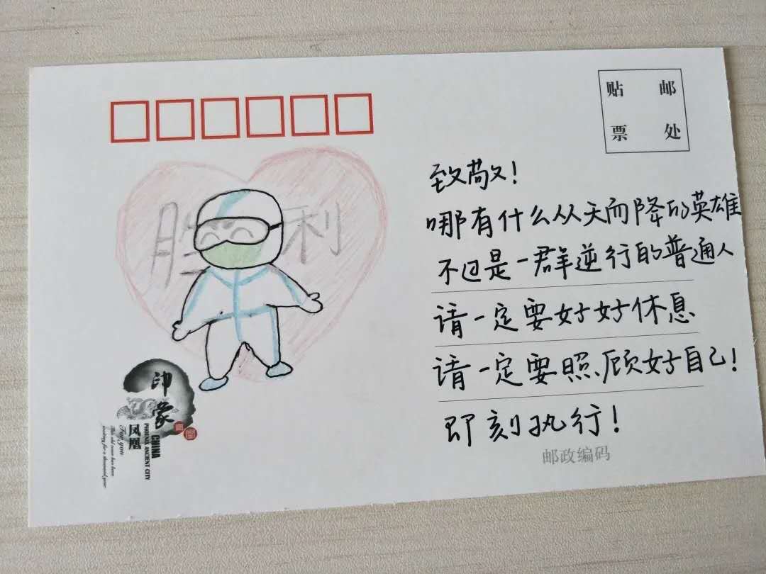 “信”里有爱。一张张小小的明信片,方寸之间展现了最美“逆行者”的风采,不仅记录下了“逆行者”抗击疫情的暖心瞬间,也传递出了全国人民“万众一心,战疫必胜”的信心和决心。(郭熙)
