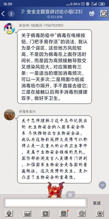 学院依托“一个官微、一个平台、一次团课、一节班会”四个平台,切实增强维护国家安全的政治责任感和历史使命感。利用学院官方微信公众号和QQ公众号推送疫情防控和安全知识的系列推文,重点宣传在抗疫一线用实际行动捍卫国家安全的先进典型及感人事迹;全体团员同上一堂以“增强国家安全意识、共同维护国家安全”为主题的团课,将“国家安全”的相关知识普及到每一位团员;学院各年级召开主题班会,全体学生同上一堂安全教育课。