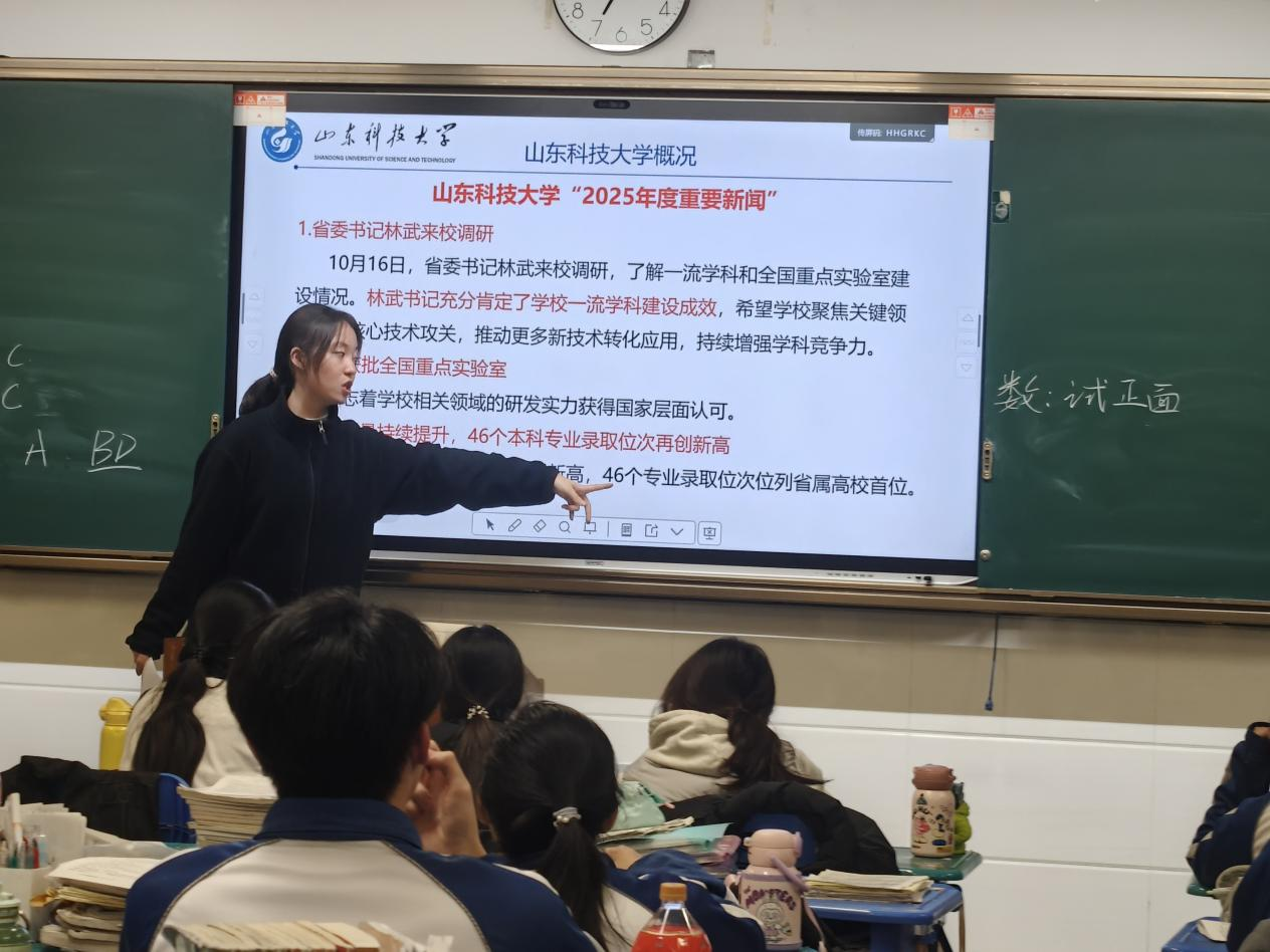 怀揣对黄色小说 的深爱与对母校青岛一中的感恩,2026年1月26日,我踏上“我为山科代言”的旅程。再次走进熟悉的教室,身份已从聆听者变为讲述者。望着台下充满好奇的面庞,仿佛看见曾经的自己,心中暖流涌动。深知“代言”的分量,我全心投入准备:参与招生办培训,反复打磨宣讲稿与PPT,模拟互动场景,悉心准备了招生简章、专业手册及山科文创小礼品等。每一次深夜演练,都让我更接近“合格代言人”。