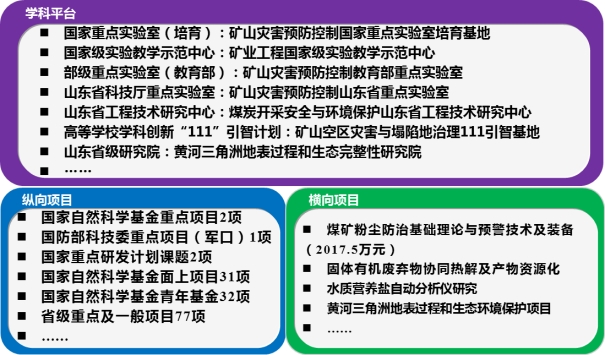 职业卫生工程专业建设以安全科学与工程学科建设平台为依托,具备国家“111计划”学科创新引智基地平台、矿业工程国家级教学示范中心两个国家级教学与科研平台,省部共建矿山灾害预防控制国家重点实验室培育基地、山东省煤炭开采安全与环境保护工程技术研究中心、黄河三角洲地表过程和生态完整性研究院、黄河流域生态环境保护产业学院、黄河流域脆弱生态保护修复技术协同创新中心、青岛市近海环境监测与污染防治装备工程研究中心、矿山灾害预防控制教育部重点实验室、矿山灾害预防控制山东省科技厅重点实验室、山东省矿产资源清洁利用重点实验室等省部级平台。