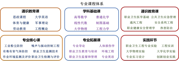 职业卫生工程专业核心课程包括:职业卫生医学基础、职业卫生法律法规、职业健康安全管理学、公共卫生应急管理、安全科学与工程、人机工程学、传热学与热害防治、通风工程、工业粉尘防控、职业卫生监测技术、噪声与振动控制工程、有毒有害气体防控、作业环境检测及评价。修业年限标准学制为4年,修完专业培养方案规定内容,学分修满165学分,准予毕业并授予工学学士学位。