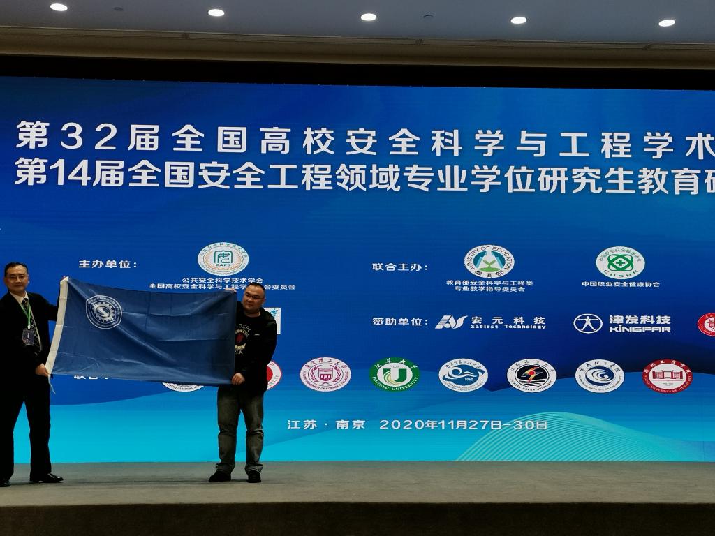 由于我校在去年已成功获得明年的全国高校安全科学与工程学术年会的主办权,在本次会议闭幕式中的交接旗仪式上周刚副院长从南京工业大学安全科学与工程学院潘旭海院长手中接过会旗,意味着我校全面进入下届年会的筹备阶段。