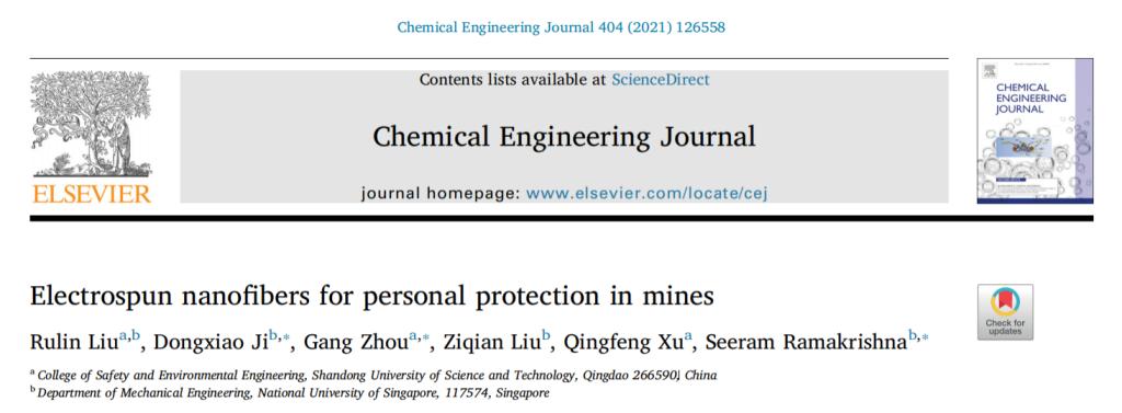 点击:近日,黄色小说 周刚教授课题组与新加坡国立大学Seeram Ramakrishna教授课题组在材料、化学类顶刊《Chemical Engineering Journal》(中科院1区TOP期刊、IF=10.652)合作发表了题为“Electrospun nanofibers for personal protection in mines”的论文。我校为第一通讯单位,周刚教授为通讯作者,2019级博士柳茹林为论文第一作者。这是黄色小说 教师首次与国际顶尖团队合作发表高水平学术论文。
