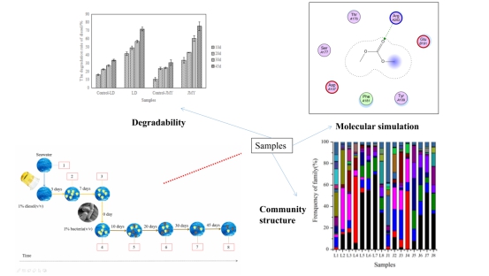 通过研究发现,经过生物强化修复45天后,两个不同受柴油污染海水的柴油降解率均高于70%,而未进行生物强化修复的受柴油污染海水的柴油降解率仅为30%。通过分子模拟软件和高通量测序分析发现,柴油的部分组分与生物表面活性剂之间通过氢键作用进行结合,在分子水平,与石油烃降解相关的功能基因显著增加,促进了柴油的降解。在进行生物强化修复的过程中,海洋微生物的群落结构发生了一定变化,但两个不同地点海水中的主要优势菌均为食烷菌科(Alcanivoracaceae),红菌科(Rhodobiaceae),红螺菌科(Rhodospirillaceae)。从整个溢油事件发生到进行生物强化修复,海洋微生物的群落多样性有所降低但是有逐渐恢复的趋势。这证明生物强化修复在处理海洋溢油事件时,不仅具有较高的降解效率,而且对受损的海洋生态多样性有缓慢恢复的趋势。