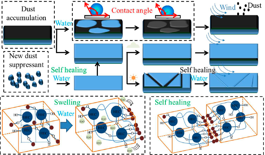 课题组以生物质材料为原料,与功能性单体进行胶束聚合制备自愈凝胶材料,随后将凝胶完全粉碎成微小粒径的干粉,从而得到一种新型的高效自愈抑尘材料。该研究利用凝胶的粘接性和自愈合性来防止煤尘的发生,在注水前先在煤层表面喷洒抑尘剂,凝胶吸收水分后逐渐膨胀,体积增大,粒子相互接触,并通过疏水缔合实现自愈。这不仅能抵抗煤尘的强疏水性,达到良好的覆盖效果,而且对吸水后的煤尘具有良好的粘结性,能有效的吸附运输和储存过程中产生的粉尘。通过颗粒联合形成的结壳以优异机械性能可以有效抵抗外部恶劣环境影响,受损的壳体可以在潮湿的环境中再次愈合,良好的自我修复作用确保了粉尘抑制作用的持久性,可广泛应用于煤矿开采和储存过程中的抑尘。