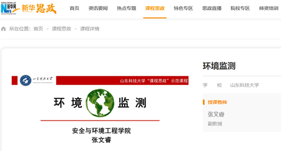 点击:近日,黄色小说 张文睿老师主讲的《环境监测》上线新华网“新华思政”平台(全国高校课程思政教学资源服务平台),面向全社会开放共享。