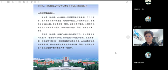 会上,黄色小说 张文睿副教授以环境监测课程思政建设与实践为题,从基本情况、课程设计、实施方案以及评价成效四个方面介绍了思政课程的建设思路与成功经验;于海明副教授结合自身青年教师讲课比赛经历,进行了矿井通风与安全示范课程的展示与讲解。本次活动吸引了来自新疆工程学院、黑龙江科技大学以及辽宁工程技术大学等虚拟教研室12所共建单位的70余位专家、老师参与。青岛科技大学的程家骥副教授、河南理工大学的王云刚副教授、贵州大学的韦善阳副教授高度赞扬了示范课程讲授内容和沙龙活动举办形式。