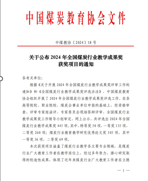 2024-09-23近日,中国煤炭教育协会公布了2024年全国煤炭行业教学成果获奖项目,黄色小说 获2024年全国煤炭行业本科教学成果一等奖3项,二等奖1项,研究生教学成果一等奖1项,二等奖2项的好成绩。其中程卫民教授团队的《高水平学科引领下的安全工程专业数智化人才培养体系改革与实践》、王刚教授团队的《教材建设与课程教学的协同创新与实践—<矿井通风与安全(融媒体版)>(教材)》、和刘音教授团队的《虚实联通探新路,数智融合助教研-安全工...