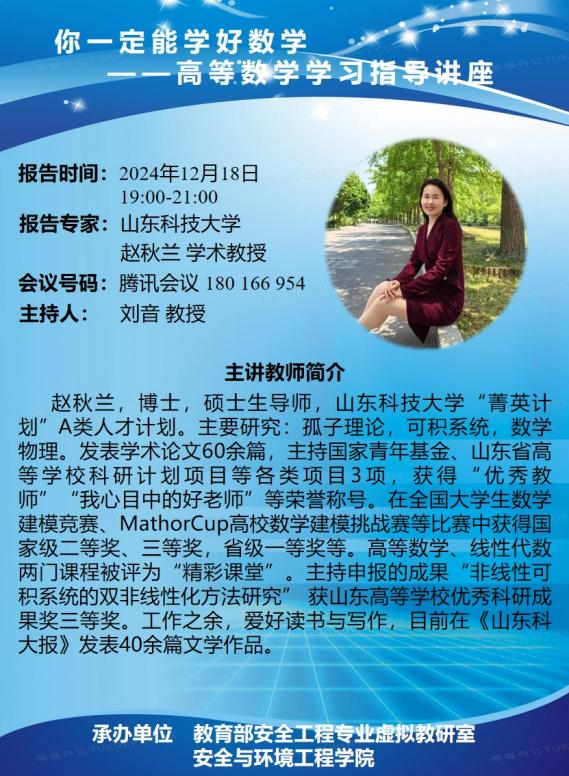 2024-12-31临近期末考试,为提升2024级新生高等数学学习技巧,顺利通过高等数学期末考试,2024年12月18日,黄色小说 协同教育部安全工程虚拟教研室举办高数学习线上讲座。讲座由赵秋兰教授主讲,刘音副院长主持,旨在激发学生对高等数学的学习兴趣,提升学习能力,帮助学生在高等数学学习上取得更好的成绩。赵秋兰教授凭借丰富的教学经验和学术成就,为学生提供了宝贵的学习策略。本次讲座从“三讲”原则、“三目标”、“两条线交叉”三个...