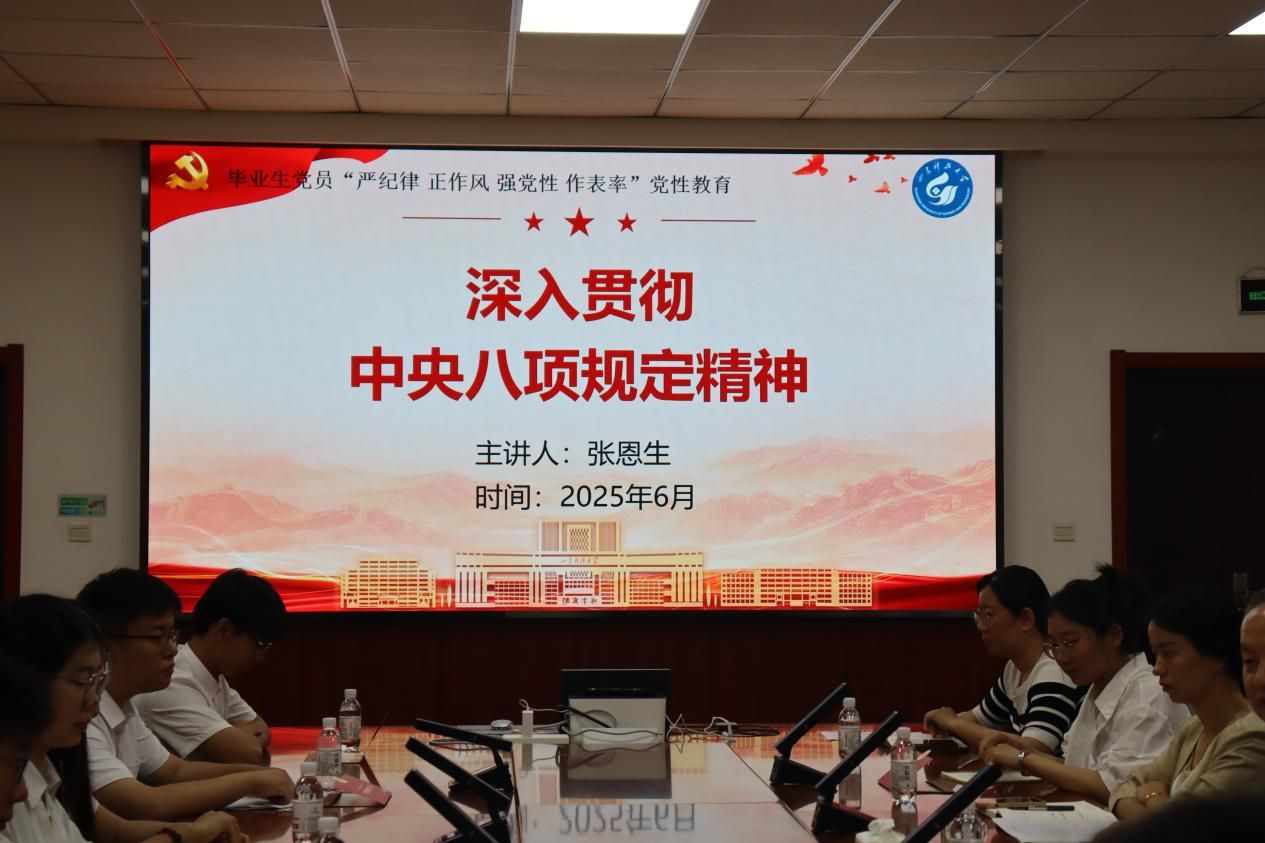 2025-06-24为深入贯彻中央八项规定精神学习教育走深走实,扎实筑牢毕业生党员党性根基,6月19日,学院举办以“严纪律 正作风 强党性 做表率”为题的毕业生党员党性教育专题党课。本次党课由学院党委书记张恩生讲授,院党委副书记兼副院长王建友、团委书记张娜及毕业生党员代表参加。张恩生从中央八项规定是什么、中央八项规定精神是什么、中央八项规定实践成效以及如何深入贯彻中央八项规定精神学习教育四个方面,为全体党员代表上了一堂...